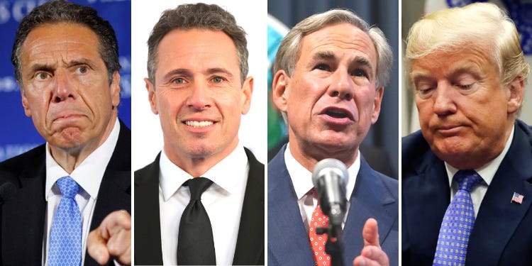I had to laugh when Chris Cuomo said on CNN this week that, because his brother is at the center of some big news stories at the moment, it's not appropriate for him (Chris) to cover those stories. Ha! Chris has been covering his brother and bringing him on his show for interviews all throughout the pandemic. Now, when the news for his brother is BAD, he can no longer cover him? -- Ben G.