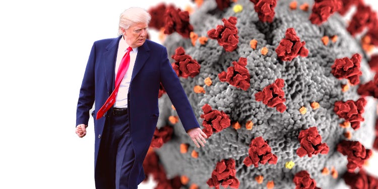 But even after numerous attendees at a breathtakingly reckless White House event (including the First Lady and people with obvious risk factors) tested positive for the virus, and even after our president suffered serious health concerns (high fever and enough difficulty breathing to require oxygen), before being flown away on a helicopter to Walter Reed (to be treated with antivirals, anti-inflammatories, an experimental antibody cocktail, steroids, and several other drugs), we’re back to the same asininity as before.