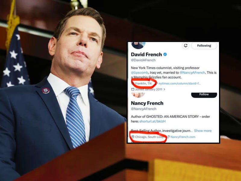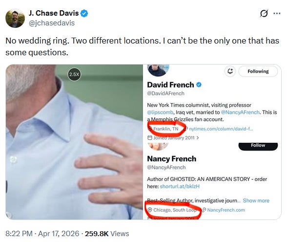 “No wedding ring,” Davis noted on X, posting a screen-capture from the episode showing French’s bare left hand. Davis also included a screen-capture of French’s profile-page, along with that of his wife Nancy, drawing attention to a discrepancy he found interesting. “Two different locations,” Davis wrote. “I can’t be the only one that has some questions.”