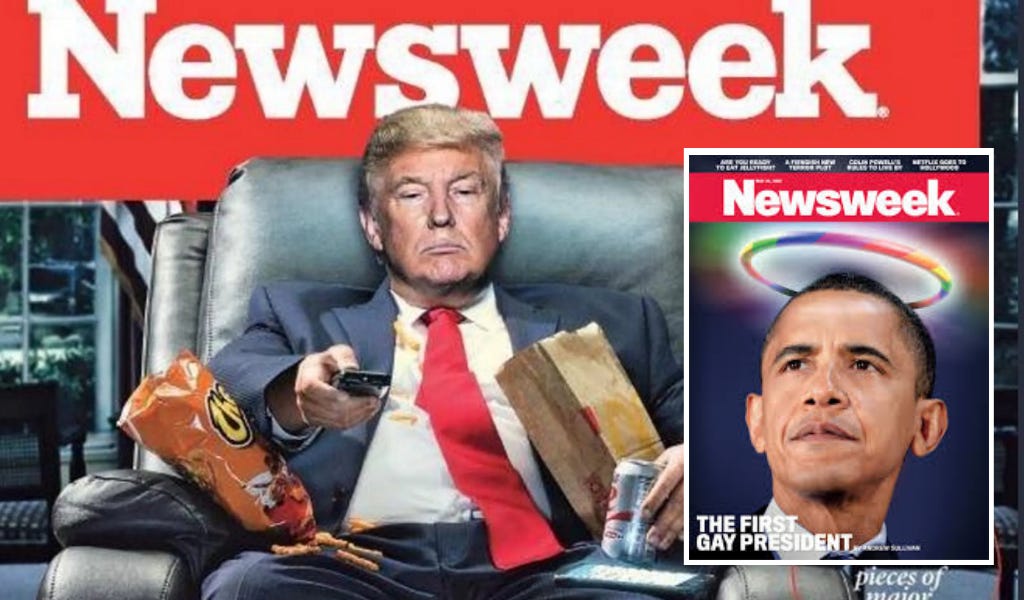 As for President Trump: Newsweek ran a cover depicting the president slouching in a recliner, a bag of fast food resting on one leg, chips on the other leg, a TV remote in his hand as he drowsily gazes in the direction of a television set. The headline: Lazy Boy.