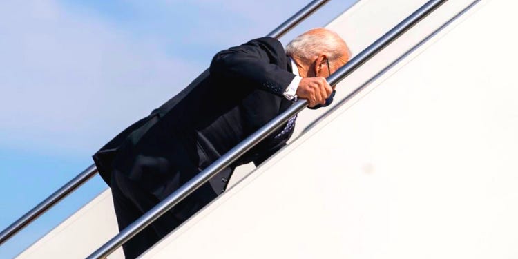 Then-presidential candidate Biden even got into the act, saying: "Look at how he steps and look at how I step. Watch how I run up ramps and he stumbles down ramps. Come on." Pretty bold for a guy who less than a year later fell down three times in a matter of seconds while trying to walk up the steps to an airplane.
