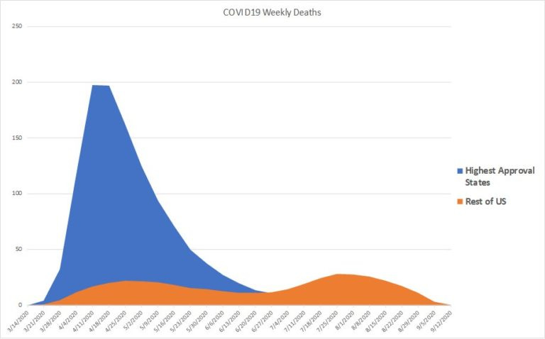 Sure, there are other factors beyond infection and death rates that should be considered when evaluating a governor’s effectiveness in dealing with the health crisis… like the economy. But there doesn’t seem to be much correlation between the economic health in these states and the polling sentiment toward their leaders. Another consideration may be a general feeling of relief, in some of these states, that the numbers have fallen and the worst is hopefully behind them.