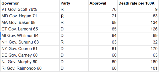 When you compare the COVID-19 job performance ratings of U.S. governors, you’ll find that of the ten at the top of the list (highest approval), eight of them are governors of states whose coronavirus death rates are over 60, per 100,000 people — a number that is well above average. Of the eight, six are Democrats. This includes Andrew Cuomo (who comes in at #7, with the second highest death-rate in the country), and New Jersey governor, Phil Murphy (who’s tied at #8, with the top death-rate of all 50 states).