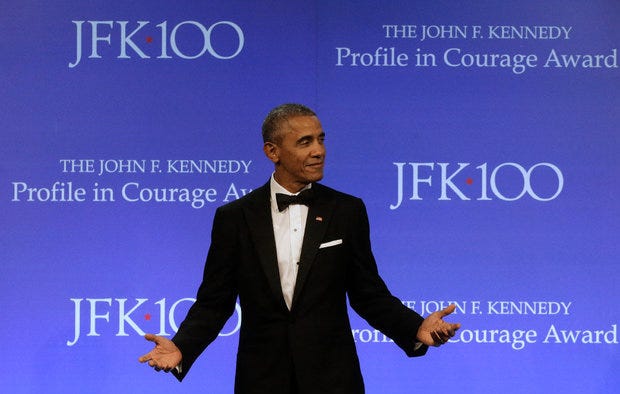 After accepting the JFK "Profile in Courage" award, Obama expanded on the topic of courage in a speech to attendees. To the surprise of no one, he applied the noble term to himself and those who supported his presidential agenda — specifically his signature piece of legislation, Obamacare.
