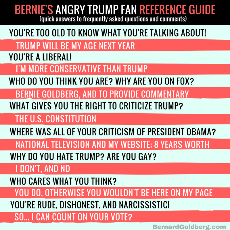 Unsurprisingly, these people rarely argued against (or even addressed) the substance of Bernie's points. Instead, their inclination was to issue personal insults, or call into question his professional credientials. Many of the responses were remarkably similar in nature, to the point where I decided to pin an "Angry Trump Fan Reference Guide" to the top of Bernie's Facebook page. Its purpose was to serve as a comprehensive response to the Trump Train, as well as a catchall for the most profanity-laced comments (so I could later delete them in one spot, as opposed to from under each individual posting).