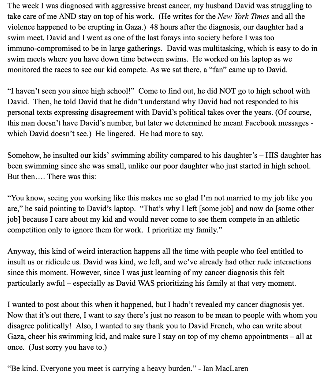 A few weeks ago I learned of a serious health challenge a friendly acquaintance has been going through. Nancy French, author and wife of New York Times columnist David French (who Bernie and I interviewed back in September), announced that she had been diagnosed with an aggressive form of breast cancer, for which she has had surgery and is currently receiving chemotherapy.