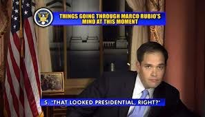 Kimmel asked, "Why was the water so far away? It would have been less awkward if [Rubio] reached down the front of his pants to get it." Letterman ran a picture of Rubio (the one above) with the caption: "That looks presidential, right?"