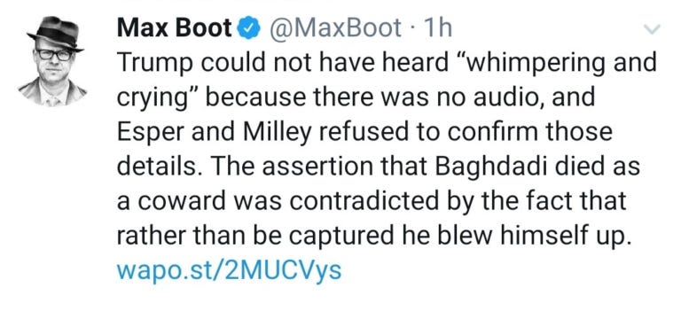 Speaking of the Washington Post, one of their columnists, Max Boot (who has renounced just about every political position he held prior to the Trump era), was so bothered by Trump’s description of al-Baghdadi’s final seconds, that he felt compelled to laud the terrorist’s courage: