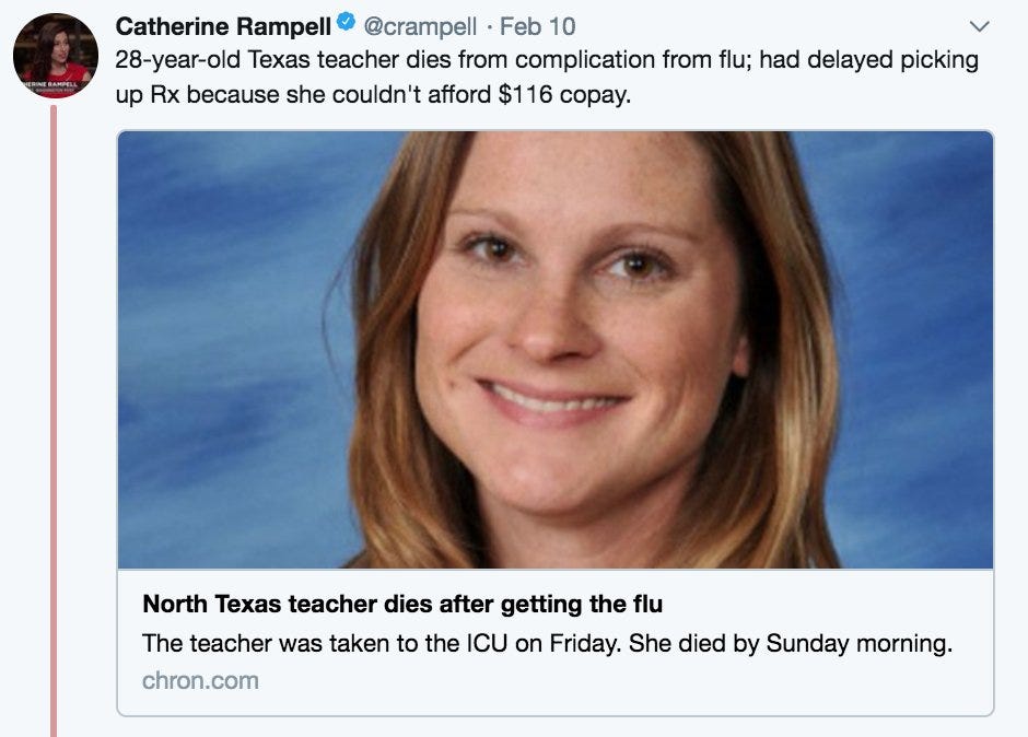This tweet from the Washington Post's Catherine Rampell received over 10,000 retweets alone: "28-year-old Texas teacher dies from complication from flu; had delayed picking up RX because she couldn't afford $116 copay."