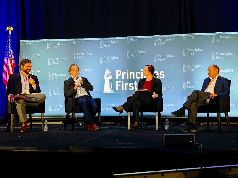 For those unfamiliar with Principles First, it’s a grassroots organization that came together on the political right out of frustration and concern with the direction of the Republican Party under Donald Trump. Founded by lawyer Heath Mayo in 2019, the movement began as a series of regional meet-up sessions around the country. This led to the annual DC event that was created as counter-programming, of sorts, to the increasingly unhinged CPAC (scheduled on the same weekend, and in the same town). The summit features lots of panels and interviews with mostly political, media, and public-policy figures. It also serves as a social gathering for like-minded, regular folks to connect.